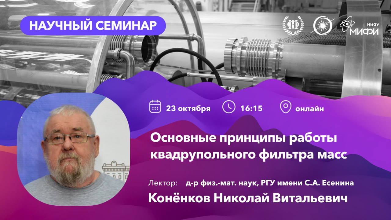 Научные семинары для аспирантовВ рамках семинара проводится курс лекций (мастер-классов) профессоров кафедры и приглашенных ученых о современных проблемах физики плазмы. 23 октября (четверг) в 16:15 на семинаре кафедры с лекцией выступит профессор, доктор физико-математических наук Конёнков Николай Витальевич (Федеральное государственное бюджетное образовательное учреждение высшего образования (ФГБОУ ВО) "Рязанский государственный университет имени С.А. Есенина"). Тема лекции - основные принципы работы квадрупольного фильтра масс. Лекция содержит детальное физико-математическое описание работы квадрупольного фильтра масс. Особое внимание уделяется теоретическим основам для проведения расчётов характеристик стандартных квадрупольных систем. 16 октября 2025 года (четверг) в 16:15 в рамках аспирантского семинара выступят заведующий кафедрой д.ф.-м.н. Юрий Микаэлович Гаспарян и старший научный сотрудник к.ф.-м.н. Алексей Александрович Айрапетов с докладами по результатам XI международной конференции "Семипалатинский испытательный полигон: наследие и перспективы развития научно-технического потенциала" и XXI всероссийской конференции "диагностика высокотемпературной плазмы" соответственно. Семинар пройдёт в аудитории 33-103 НИЯУ МИФИ в очном формате. 09 октября (четверг) в 16:15 на аспирантском семинаре кафедры с обзорными докладами по материалам конференций Gas Discharge Plasmas and Their Applications и Plasma Physics and Plasma Technologies, прошедших в сентябре 2025 года выступили доцент кафедры к.ф.-м.н. Казиев Андрей Викторович и аспирант кафедры Бутняков Даниил Алексеевич соответственно. 25 сентября (четверг) в 16:15 на аспирантской семинаре кафедры с докладом выступит А.Е. Иешкин, к.ф.-м.н., в.н.с. кафедры физической электроники, физический факультет МГУ имени М.В. Ломоносова. Тема доклада "Модификация поверхности многокомпонентных материалов газовыми кластерными ионами". Семинар пройдёт в аудитории 33-103 НИЯУ МИФИ в очном формате. Аспирантский семинар кафедры физики плазмы пройдёт 19 сентября (пятница) 16:15. 2 июля (среда) в 15:00 в рамках аспирантского семинара кафедры физики плазмы состоится доклад младшего научного сотрудника кафедры Ефимова Никиты Евгеньевича по материалам диссертации на соискание ученой степени кандидата физико-математических наук (предзащита) на тему "Спектроскопия малоуглового рассеяния ионов для анализа поверхностных слоёв элементов обращённых к плазме". 7 мая (среда) в 15:00 в рамках аспирантского семинара кафедры физики плазмы состоялся доклад Павла Романовича Науменко на тему "Использование волн МГц-диапазона для ИЦР-предыонизации на малом сферическом токамаке МИФИСТ-0". 17 апреля (четверг) в 17:00 в рамках аспирантского семинара кафедры физики плазмы состоялся доклад Ананьева Сергея Станиславовича по материалам диссертации на соискание ученой степени доктора физико-математических наук (предзащита) Совместный научный семинар кафедры теорфизики и института ЛАПЛАЗ 12 марта (среда) в 15:00 в рамках семинара кафедры физики плазмы состоялся доклад старшего преподавателя кафедры физики плазмы Игоря Дмитриевича Егорова 5 марта (среда) в 15:00 в рамках семинара кафедры физики плазмы состоялся доклад по материалам кандидатской диссертации (предзащита) Хуснутдинова Радмира Ильдаровича на тему "Расчетно-теоретические модели спектроскопической диагностики